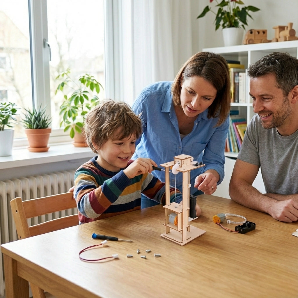 - Jeu après la construction : une fois terminé, l’ascenseur monte et descend vraiment, pour s’amuser et expérimenter.